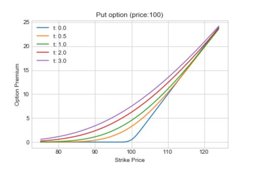 以前書いたブラックショールズモデルの関数を使って、権利行使までの時間と行使価格を動かしてグラフを描いてみようと思う。 swdrsker.hatenablog.com 権利行使までの時間が長くなるほど緩やかな曲線になるのを見たい。 import numpy as np from scipy impor…